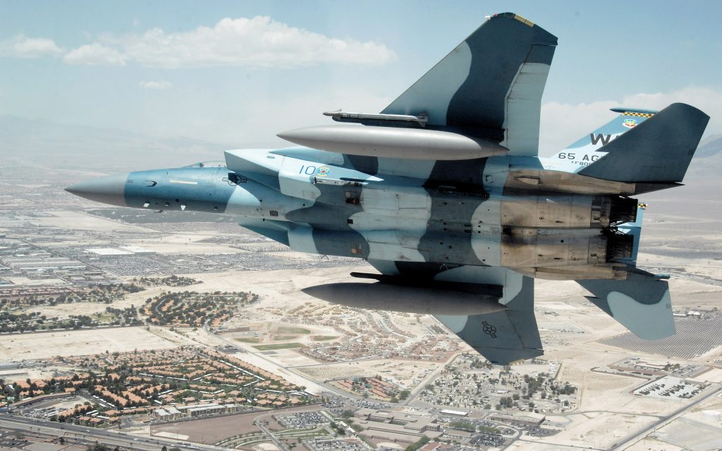 An F-15 Eagle from the 65th Aggressor Squadron pitches out for landing on 5 June, 2008 at Nellis Air Force Base, Nev. The Aggressor mission is to prepare the combat air forces, joint and allied aircrews for tomorrow’s victories with challenging and realistic threat replication, training, academics and feedback. (U.S. Air Force photo/ Master Sgt. Kevin J. Gruenwald) released